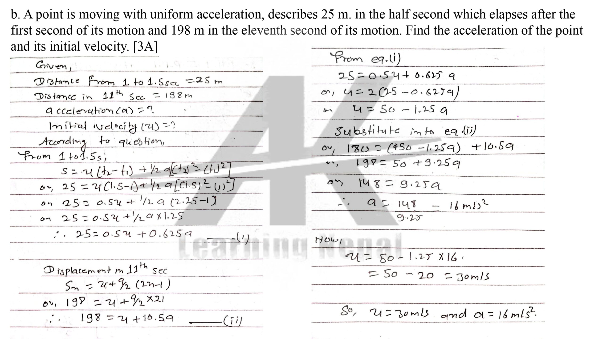 A point is moving with uniform acceleration, describes 25 m. in the half second which elapses after the first second of its motion and 198 m in the eleventh second of its motion. Find the acceleration of the point and its initial velocity.