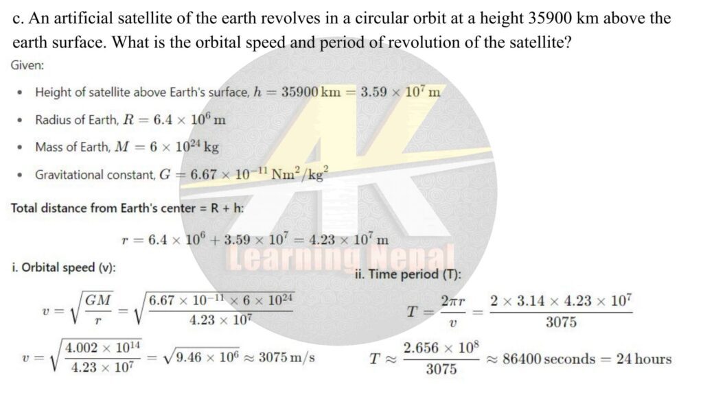 An artificial satellite of the earth revolves in a circular orbit at a height 35900 km above the earth surface. What is the orbital speed and period of revolution of the satellite?