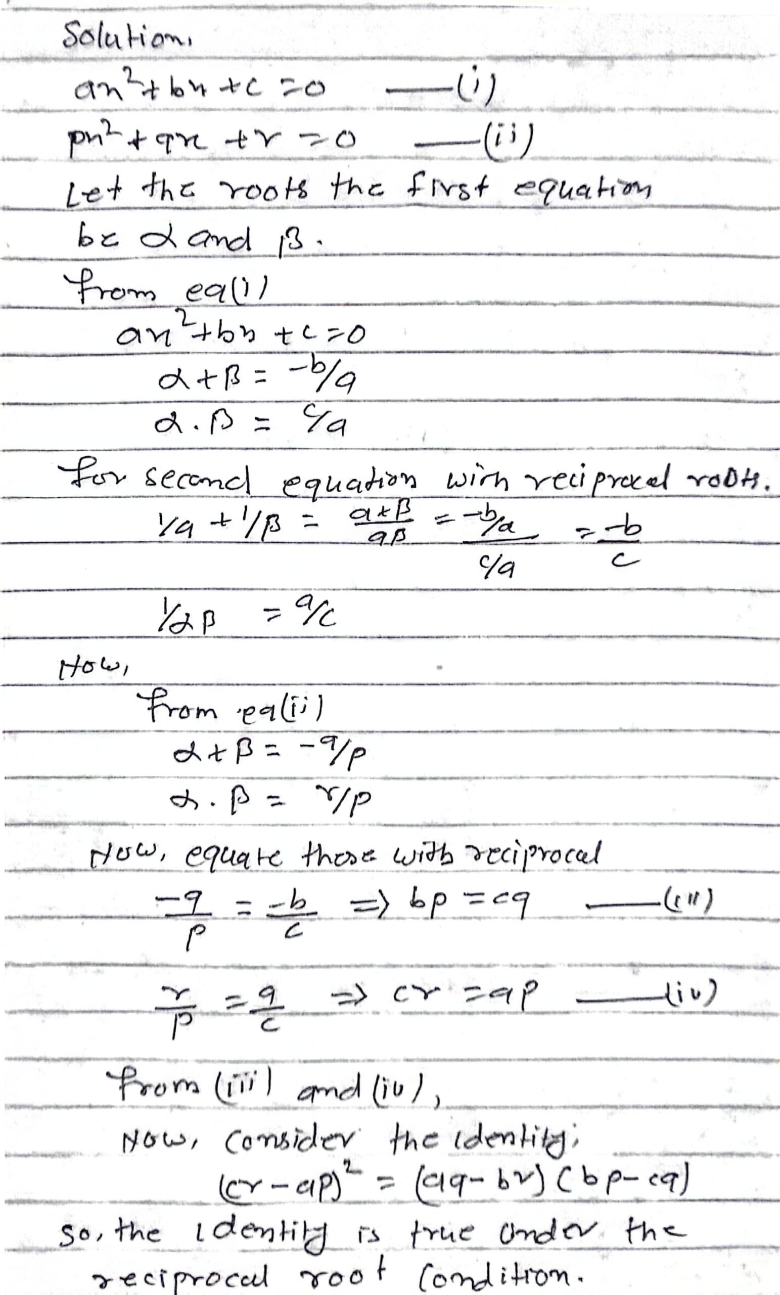 ax²+bx+c=0 and px²+qx+r=0 are any two quadratic equations. Find the condition that the roots of ax²+bx+c=0 is reciprocal to the roots of px²+qx+r=0. SOLUTION Related posts:Equation of Any Line Parallel to Ax + By + C = 0Equation of Any Line Perpendicular to Ax + By + C = 0Share this: Share on Facebook (Opens in new window) Facebook Email a link to a friend (Opens in new window) Email Share on Telegram (Opens in new window) Telegram Share on WhatsApp (Opens in new window) WhatsApp Print (Opens in new window) Print Share on X (Opens in new window) X Related Download PDF