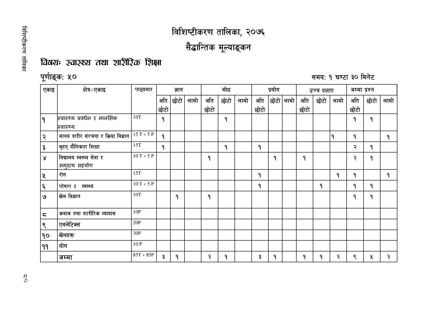 This analysis is based on the official “लक्ष्यीकरण तालिका (Specification Chart)” PDF for Class 10 Health and Physical Education, published by CDC Nepal. This subject uniquely has both Theory (T) and Practical (P) components with equal weightage.