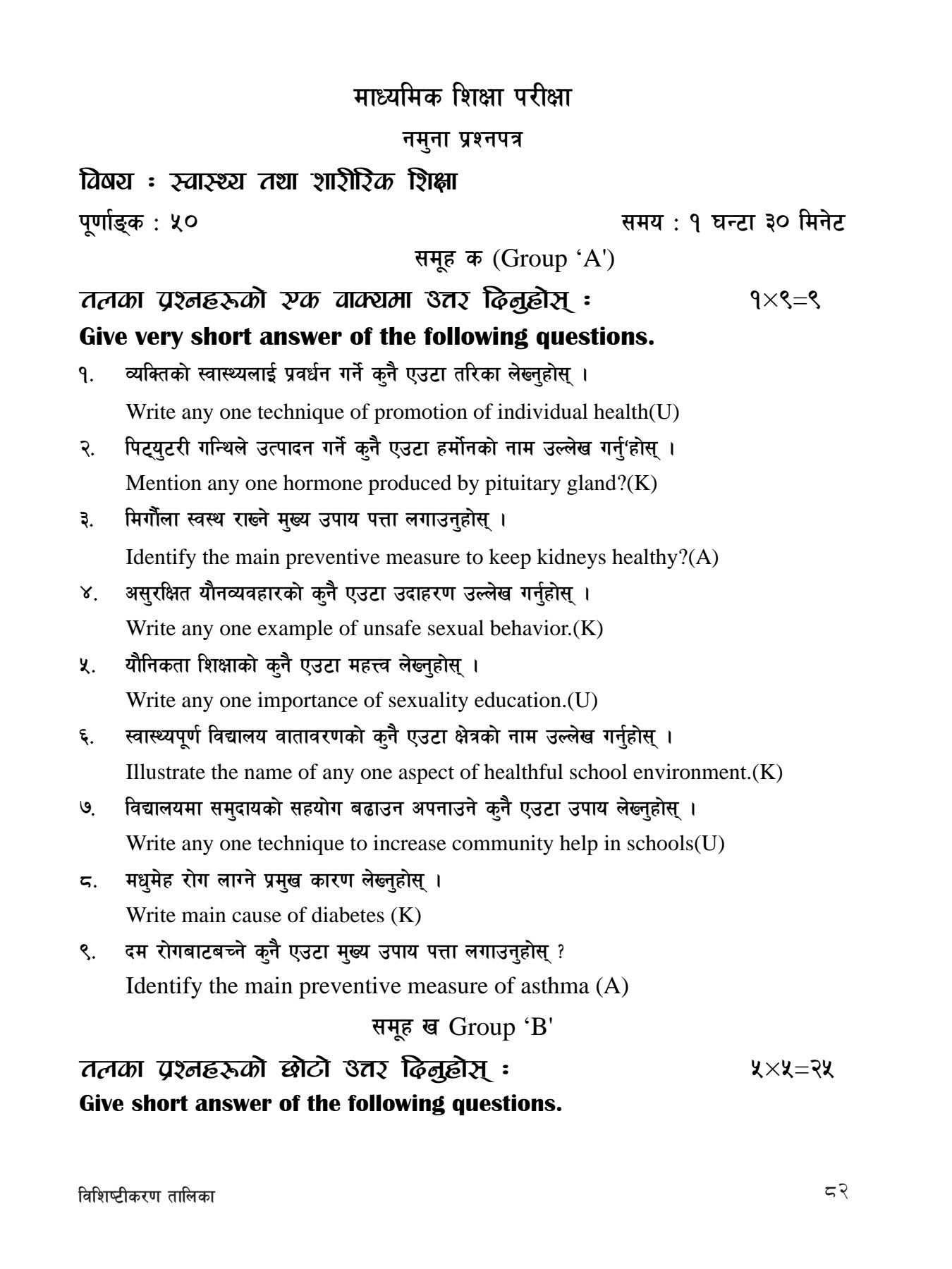 This model question paper is developed by the Curriculum Development Centre (CDC), Nepal specifically for Grade 10 Health & Physical Education