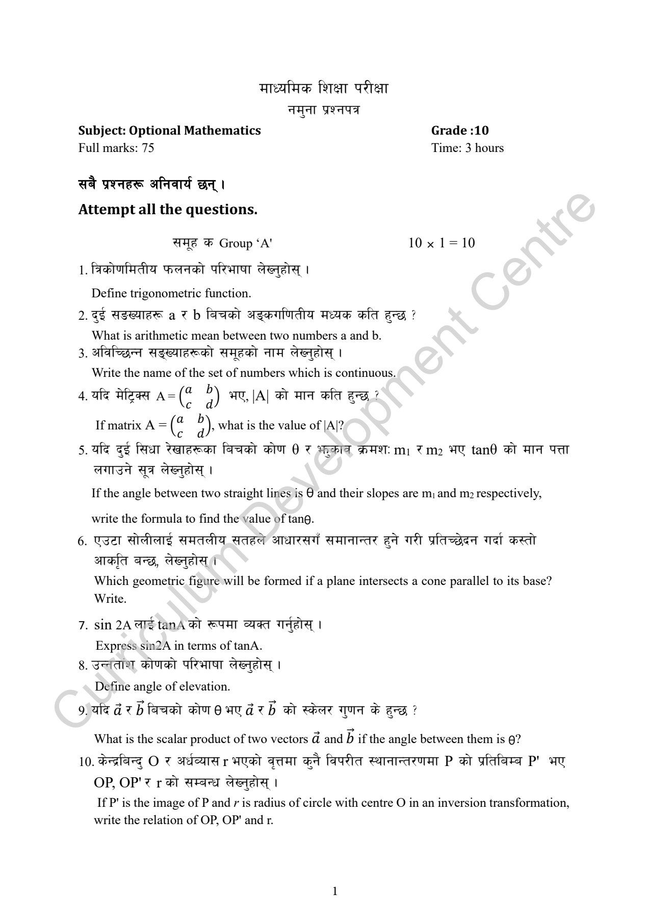 This model question paper is developed by the Curriculum Development Centre (CDC), Nepal specifically for Grade 10 Optional Mathematics.