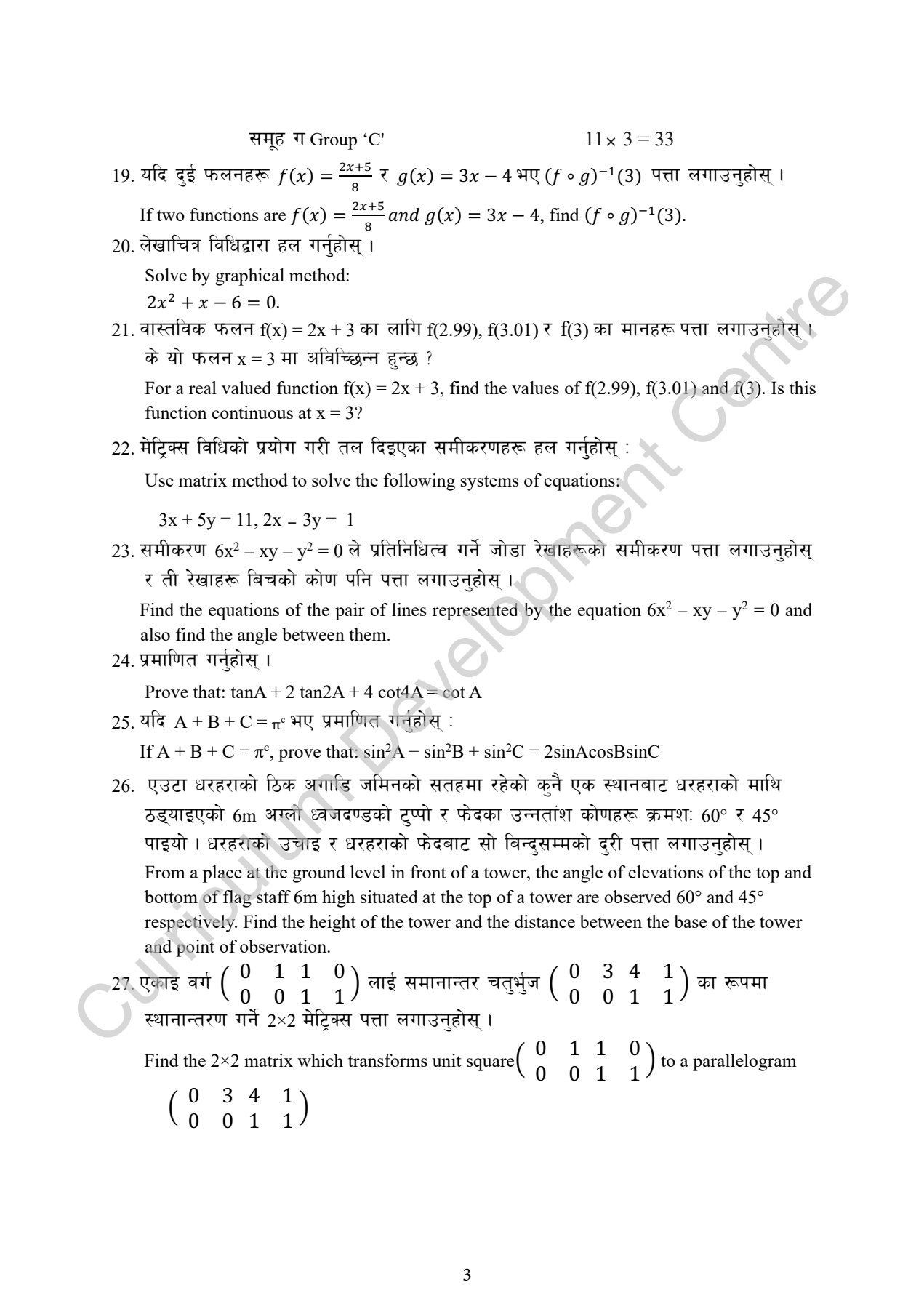 • Group C (3 marks): 11 questions × 3 marks = 33 marks