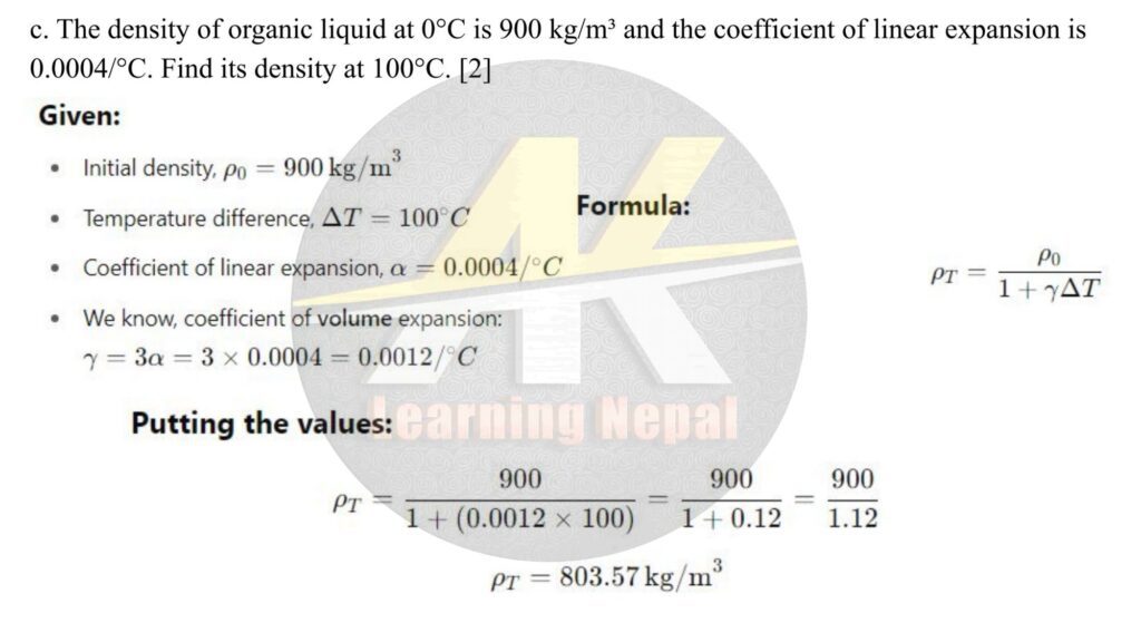 The density of organic liquid at 0°C is 900 kg/m and the coefficient of linear expansion is 0.0004/°C. Find its density at 100°C.