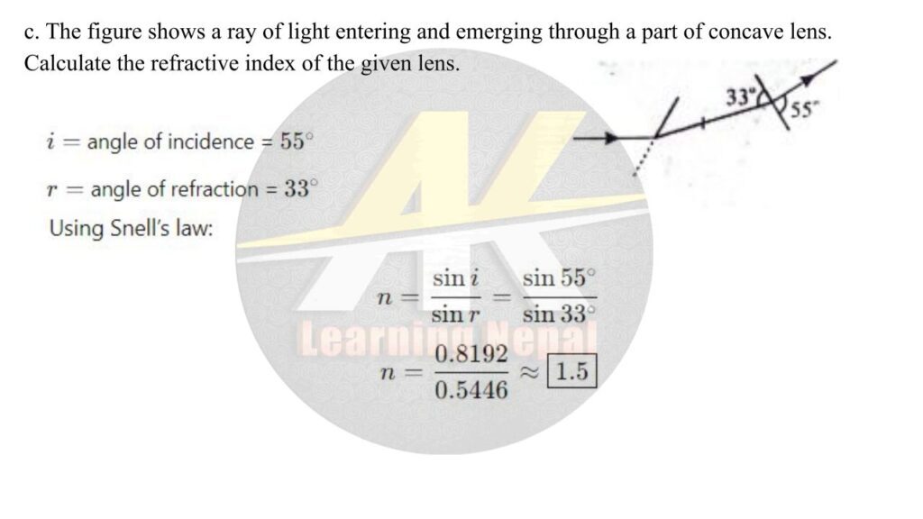 The figure shows a ray of light entering and emerging through a part of concave lens. Calculate the refractive index of the given lens.